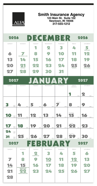 Glance at all three months with the current month having memo blocks and the before and after months shown as a reference. This planner is useful and impressive. The calendar grid is printed in green. Price includes a 1 color print. Pricing shown is for insurance agents only.