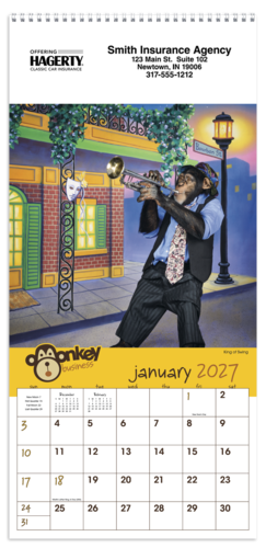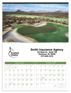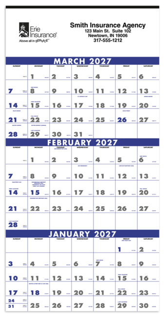 Showing three months at once, this calendar is easy-to-read and useful. Simply tear off the old month at the perforation and a new one appears. The calendar grid is printed in blue. Price includes a 1 color print. Pricing shown is for insurance agents only.