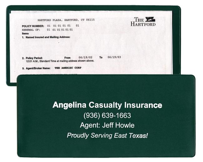 Large vinyl insurance card holder custom printed with your contact information. Solid vinyl on one side with clear vinyl on the other side forms a pocket that your customers can insert their insurance card and registration. Your business name and contact information will be handy and accessible when needed. Made in the USA.