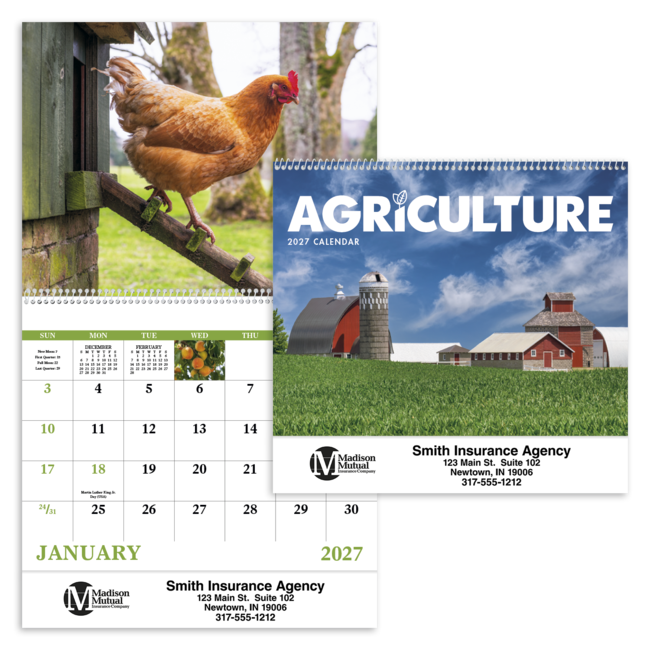 Simple images bring country living to life in this 13-month appointment calendar. More than one in six U.S. jobs stems from agriculture. Price includes 1 color print, 1 location (bottom). Bulk envelopes, add $.25 each; inserted, add $.50 each. Full color imprint available, add $.10 each.