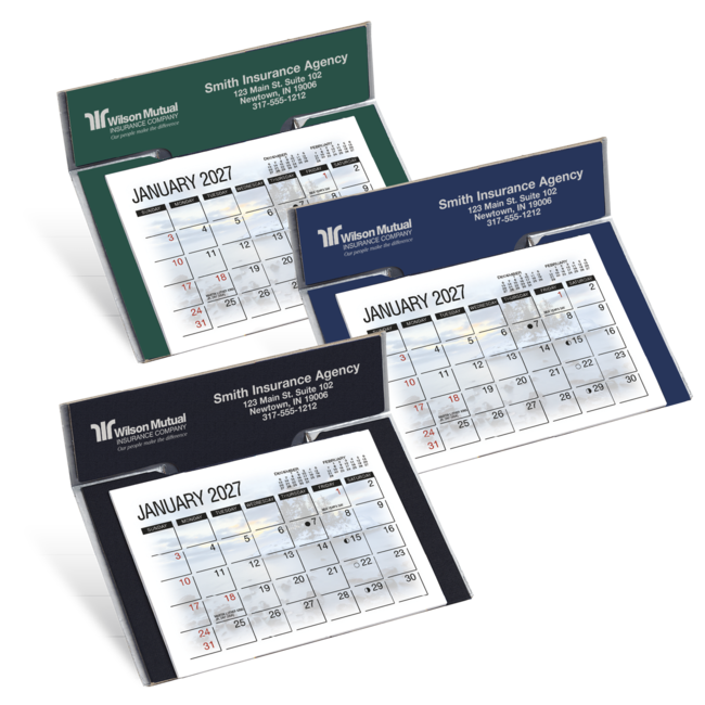 This unique and eye-catching desk calendar offers big color in a compact size. The scenic beauty is always a popular and well-received choice. The cover has a December calendar - perfect for early distribution. Available in black, green or navy. Price includes foil imprint on top of mount.