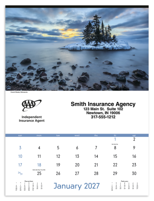 Remarkable photos of America highlight each month and descriptions of each location accompany the photos. This calendar also features a large, easy-to-read date pad. No set-up charge. Inserted in tubes, add $1.25 each calendar.