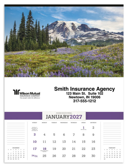 View the splendor of America in this beautiful 12-sheet calendar. With photographs of various locations in America, this will appeal to many businesses. Accent colors on date pad change each month to match photos. No set-up charge. Inserted in tubes, add $1.25 each calendar.