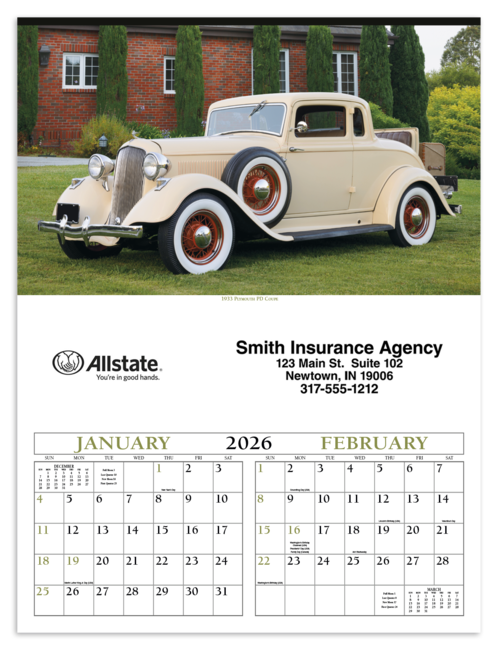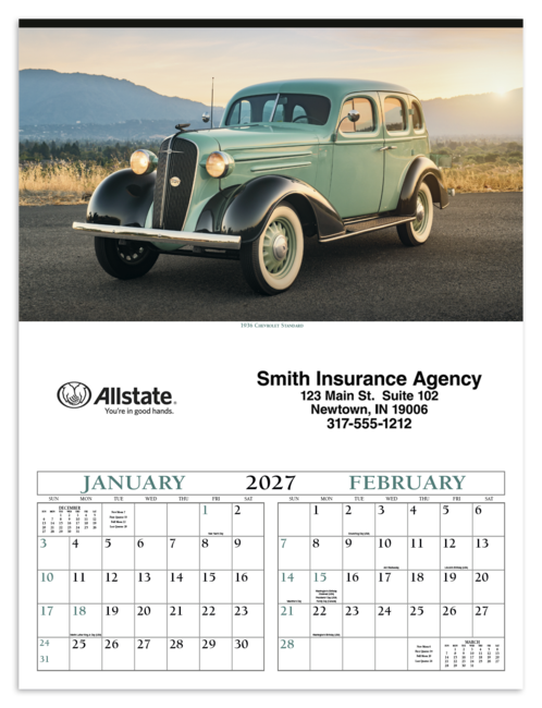 Classic, collector and antique cars, along with a brief description of their history, make this calendar an excellent gift. It offers ample writing space, and personalization is available. The FSC® label means that the materials used for this product come from well-managed FSC®-certified forests and other controlled sources. Price includes a 1 color print. Pricing shown is for insurance agents only.