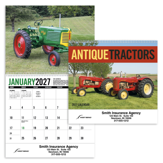 This spiral Triumph calendar features beautifully restored tractors of yesteryear. Price includes 1 color imprint, 1 location. Bulk envelopes, add $.25 each; inserted, add $.50 each.