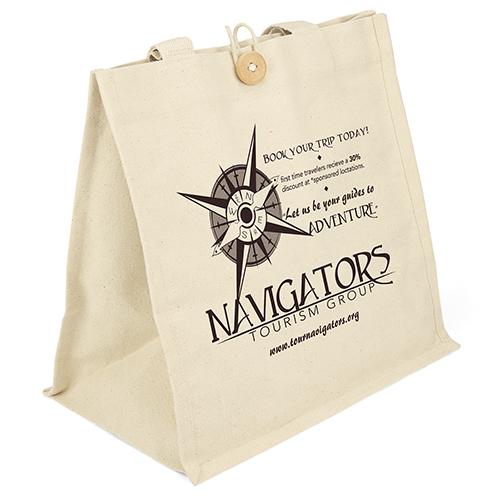 Stylish and strong enough to hold up to heavy loads, the reusable Aurora™ Tote is made from durable 10-oz. cotton. Features wooden buttons with loop closures and 1 ¼"-wide x 28"-long cotton twill handles.