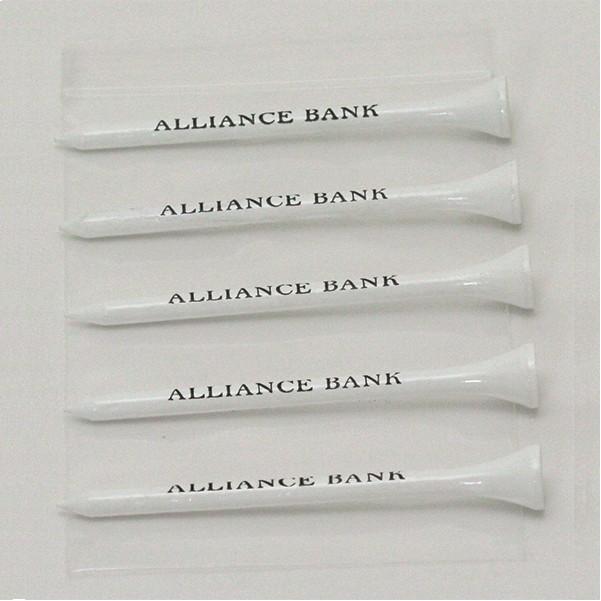 Package of five wood 3 1/4" custom imprinted logo golf tees in 2mm resealable zip lock bag.Fast Quick Turnaround! Rush service available. An inexpensive way of promoting your logo, great handouts at trade shows or golf tournaments. 3 1/4" L