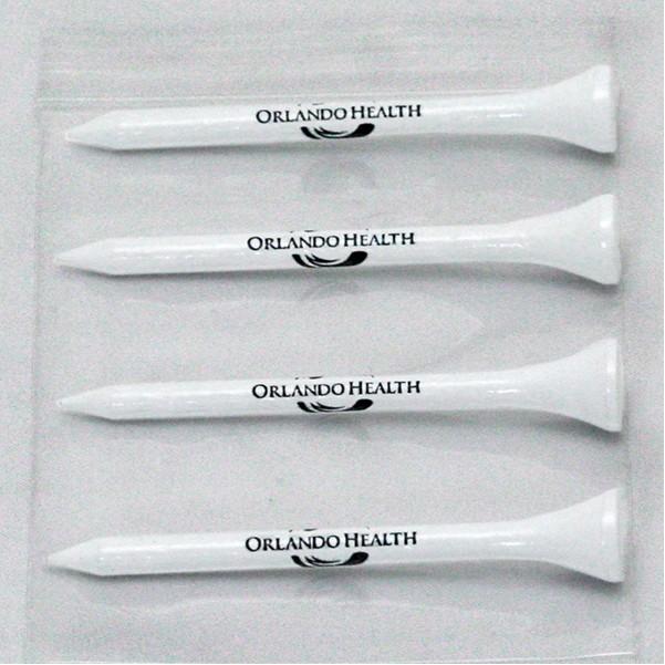 Package of four wood 2 3/4" custom imprinted logo golf tees in 2mm resealable zip lock bag.Fast Quick Turnaround! Rush service available. An inexpensive way of promoting your logo, great handouts at trade shows or golf tournaments. 2 3/4" L