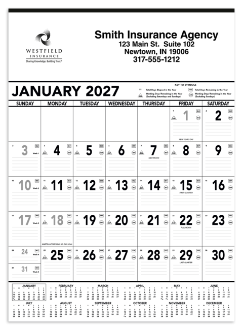 Product pricing includes standard imprint color black, 1 location. This giant planner is used in most industries. Date blocks contain faintly ruled lines along with symbols denoting the days elapsed and remaining in the year, work days remaining without Sunday & Saturday and work days remaining without Sunday. December top sheet included at no extra charge.