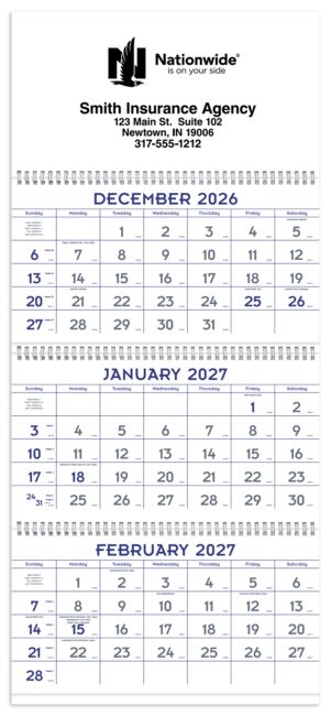 This 14-month calendar runs from December through January. The 4-panel/3 pad style is twin-looped and has a large imprint area. Price includes a 1 color print. Pricing shown is for insurance agents only.