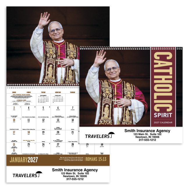 This 13-month calendar features an inspiring guide to daily Catholic Liturgy. Price includes 1 color print, 1 location (bottom). Bulk envelopes, add $.25 each; inserted, add $.50 each. Full color imprint available, add $.10 each.
