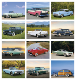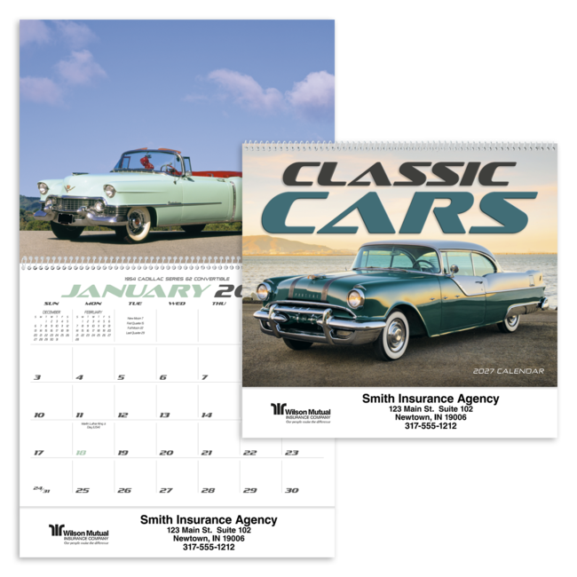 Classic cars from the 1940s, 1950s and 1960s fill the months of this Triumph spiral calendar. Price includes 1 color print, 1 location (bottom). Bulk envelopes, add $.25 each; inserted, add $.50 each.