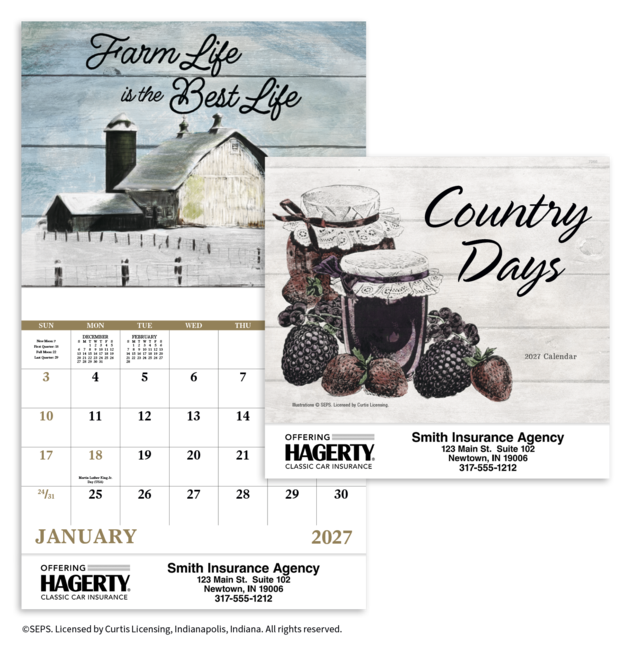 This 13-month calendar features vintage style signs that add nostalgic fun to home, office or garage. Eye-catching images will draw attention to your add all year long. Bulk envelopes, add $.25 each; inserted, add $.50 each. Full color imprint available, add $.10 each. Product pricing includes up to 5 lines of text with one imprint color on gloss paper stock with UV coated cover.