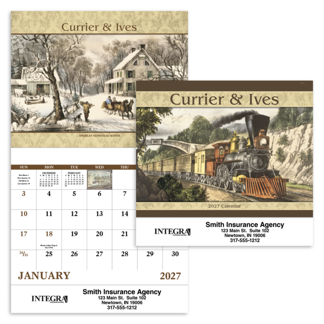 Take customers on a 13-month trip down memory lane with these nostalgic illustrations. Bulk envelopes, add $.25 each; inserted, add $.50 each. Full color imprint available, add $.10 each. Product pricing includes up to 5 lines of text with 1 imprint color on gloss paper stock with UV coated cover.