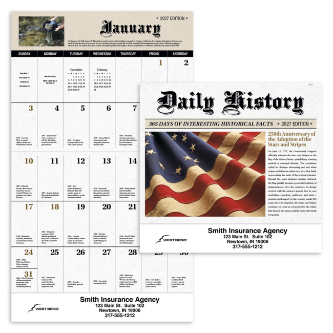 This 13-month calendar features fascinating facts that brings American history to life. Eye-catching images will draw attention to your add all year long. Bulk envelopes, add $.25 each; inserted, add $.50 each. Full color imprint available, add $.10 each. Product pricing includes up to 5 lines of text with one imprint color on gloss paper stock with UV coated cover.