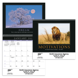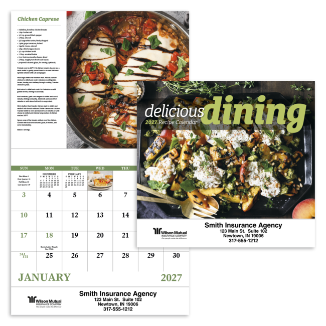 Recipes of delightful dishes are combined with full-color photos to tantalize the taste buds in this 13-month calendar. Bulk envelopes, add $.25 each; inserted, add $.50 each. Full color imprint available, add $.10 each. Product pricing includes up to 5 lines of text with 1 imprint color on gloss paper stock with UV coated cover.