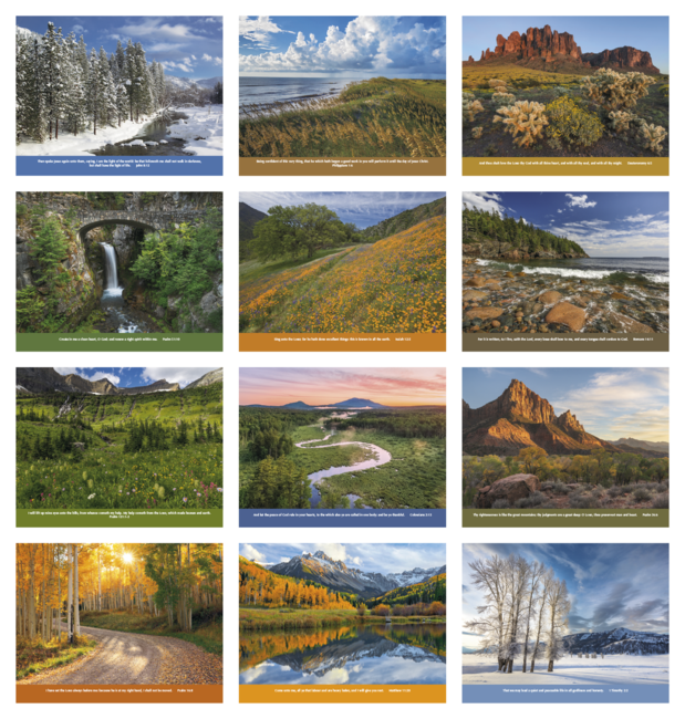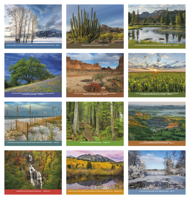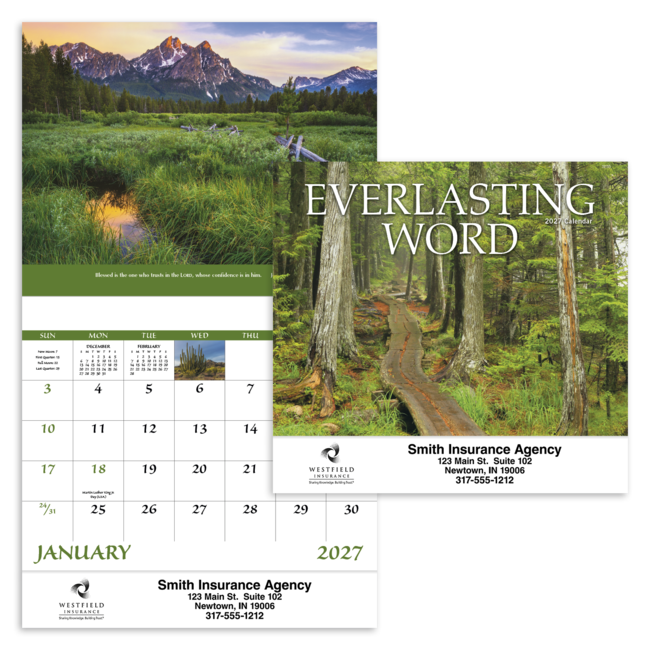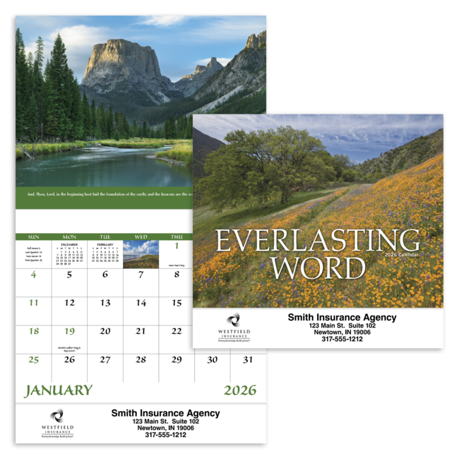 Features Bible verses from the King James Version. Calendar size is 11" w x 10" h closed, 11" w x 19" h open. Eye-catching images will draw attention to your add all year long. Bulk envelopes, add $..25 each; calendars inserted, add $.50 each. Product pricing includes up to 5 lines of text with standard imprint color black on gloss paper stock with UV coated cover.