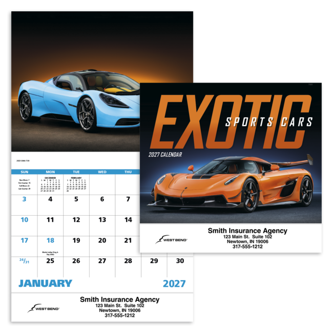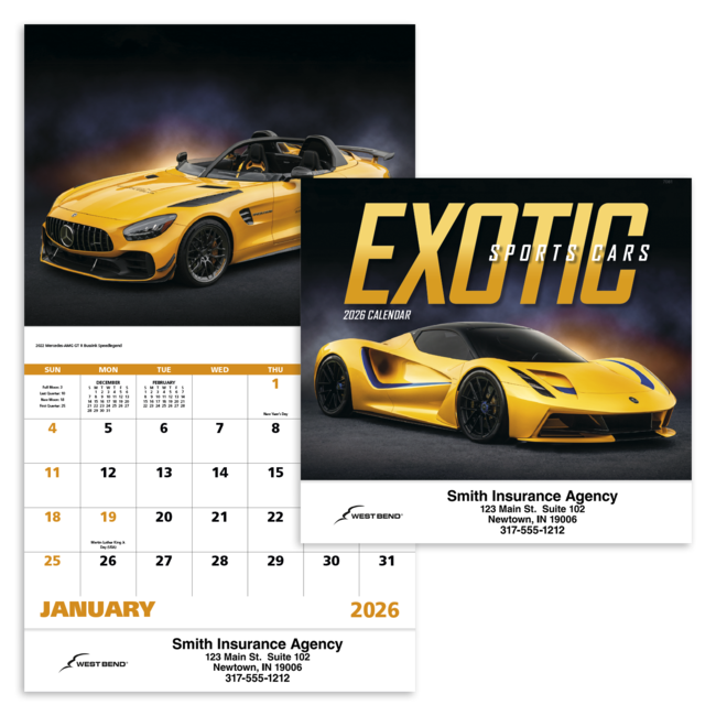 Stunning shots of the most coveted vehicles on the road will get your motor running with this 13-month calendar. Bulk envelopes, add .$.25 each; inserted, add $.50 each.. Full color imprint available, add $.10 each. Product pricing includes up to 5 lines of text with 1 imprint color on gloss paper stock with UV coated cover.