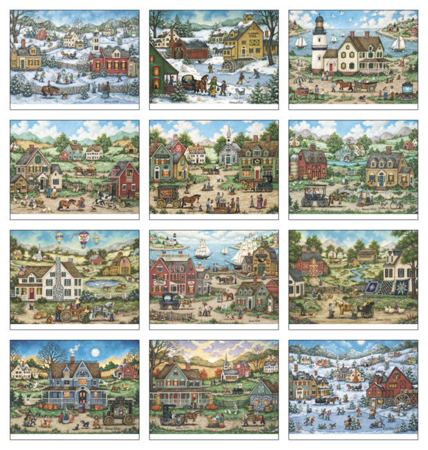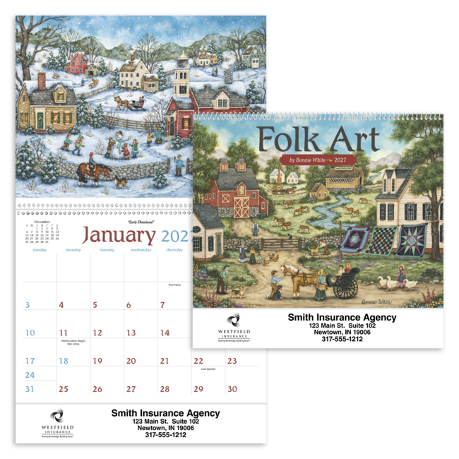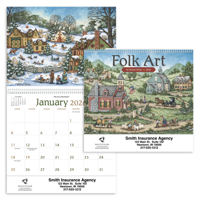 Artist Bonnie White captures the customs of early America in her art with this Triumph spiral calendar. Price includes 1 color print, 1 location (bottom). Bulk envelopes, add $.25 each; inserted, add $.50 each.