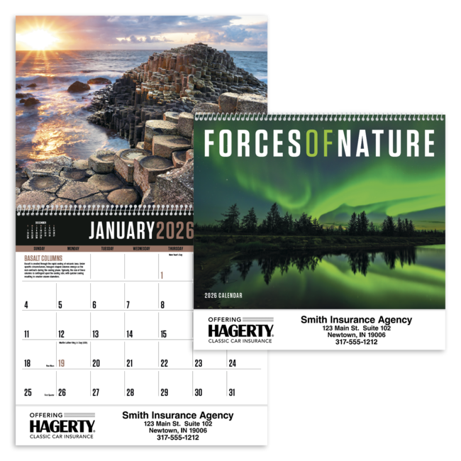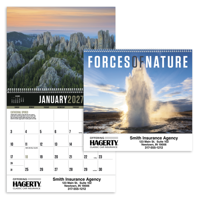 This interesting Triumph spiral calendar highlights nature's most unusual phenomena, with spectacular photos and detailed information. Price includes 1 color print, 1 location (bottom). Bulk envelopes, add $.25 each; inserted, add $.50 each.