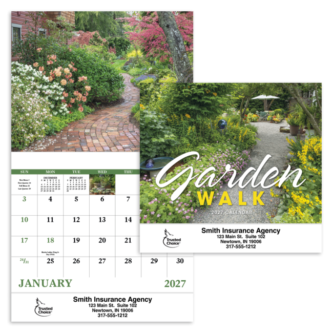 Colorful photos of various garden settings bring the outdoors in with this 13-month calendar. Eye-catching garden images will draw attention to your add all year long. Bulk envelopes, add $.25 each; inserted, add $.50 each. Full color imprint available, add $.10 each. Product pricing includes up to 5 lines of text with 1 imprint color on gloss paper stock with UV coated cover.