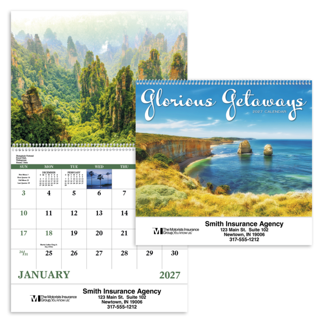 Scenic photos of vacation destinations provide a wonderful visual in this 13-month calendar. Price includes 1 color print, 1 location (bottom). Bulk envelopes, add $.25 each; inserted, add $.50 each. Full color imprint available, add $.10 each.