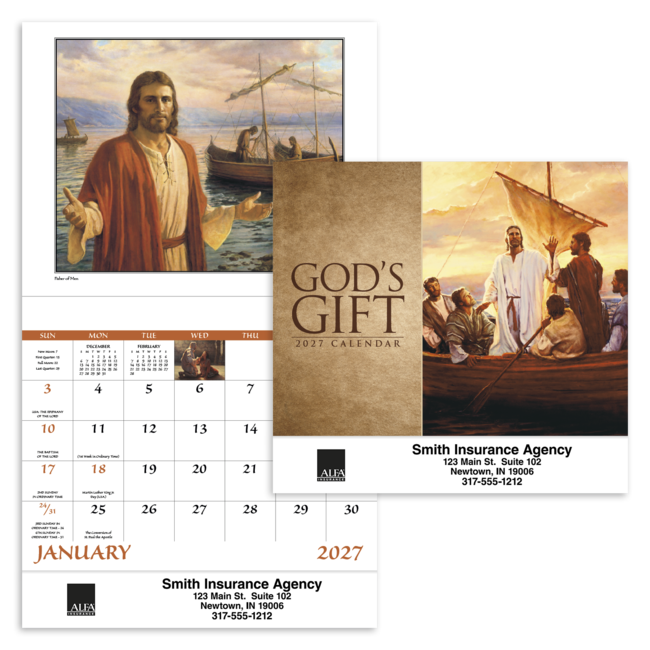 This 13-month calendar features Roman Catholic observances in this religious calendar.. Eye-catching images will draw attention to your add all year long. Bulk envelopes, add $.25 each; inserted, add $.50 each. Full color imprint available, add $.10 each. Product pricing includes up to 5 lines of text with one imprint color on gloss paper stock with UV coated cover.