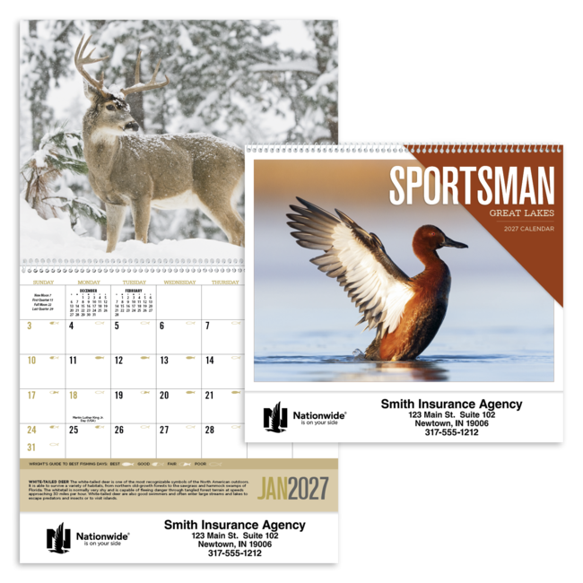 Specialized regional copy in calendar date blocks covering MN, IA, WI, IL, MI, IN & OH. Includes Wright's Guide to the best fishing days. Perfect for planning outdoor activities in advance. Price includes 1 color print, 1 location (bottom). Bulk envelopes, add $.25 each; inserted, add $.50 each.