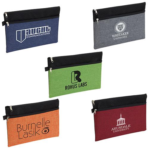 2-tone 300D and black non-woven material. Front pocket has PVC lining. 2 zippered compartments. 2-tone Heathered/Black material. Pen loop.