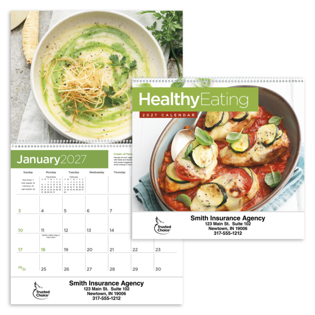 Healthy eating can be delicious too with these 12 mouth-watering foods and the make-it-healthy tips with each picture in this Triumph spiral calendar. Price includes 1 color print, 1 location (bottom). Bulk envelopes, add $.25 each; inserted, add $.50 each. Full color imprint available, add $.10 each.