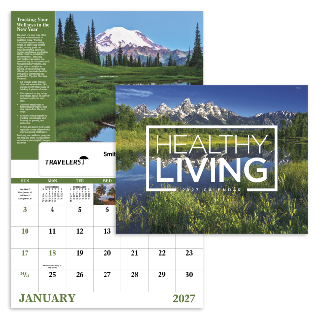 This calendar features images of majestic natural wonders plus healthy living tips in this 13-month calendar. Bulk envelopes, add $.25 each; inserted, add $.50 each. Product pricing includes up to 5 lines of text with standard imprint color black on gloss paper stock with UV coated cover.