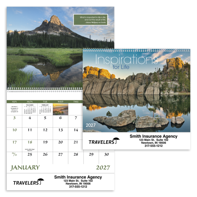 Special pricing for Insurance Agencies only! Captivating scenery with inspirational messages can build business relationships and boost employee morale with this 13-month calendar. Price includes 1 color print, 1 location (bottom). Bulk envelopes, add $.25 each; inserted, add $.50 each. Full color imprint available, add $.10 each.