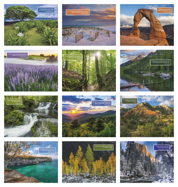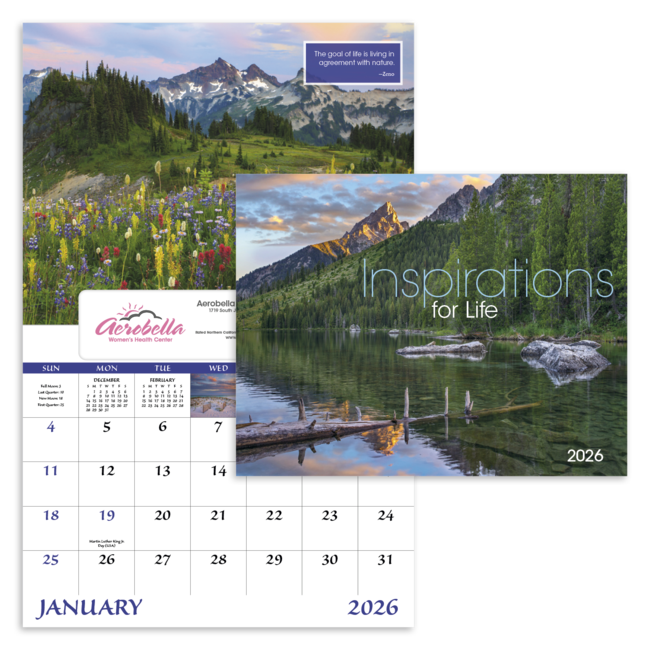 This 13-month window calendar features amazing scenes and inspiring quotes support your message. Price includes 1 color print, 1 location. Bulk envelopes, add $.25 each; inserted, add $.50 each. Full color imprint available, add $.10 each.