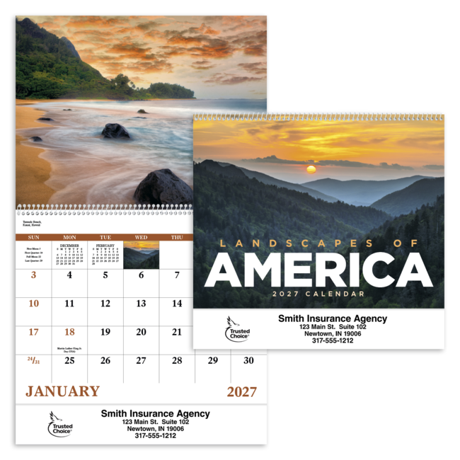 This 13-month calendar features stunning, colorful landscapes from across America. Price includes 1 color print, 1 location (bottom). Guaranteed inventory. Bulk envelopes, add $.25 each; inserted, add $.50 each. Full color imprint available, add $.10 each.