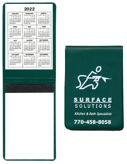 This item has a clear pocket on the inside of the cover to hold small cards such as business cards and includes a 100 page pad. A 2 year calendar card is inserted in the inside pocket. Made in the USA.