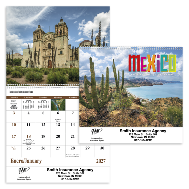 A colorful and cultural, 13-month calendar for any marketer that needs to reach their Latino audience. Price includes 1 color print, 1 location (bottom). Bulk envelopes, add $.25 each; inserted, add $.50 each. Full color imprint available, add $.10 each. al quantity delivered.