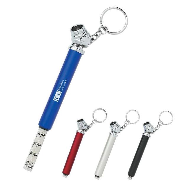 This mini tire gauge key chain is a great giveaway! Made of aluminum; max: 50 PSI. Individually polybagged.