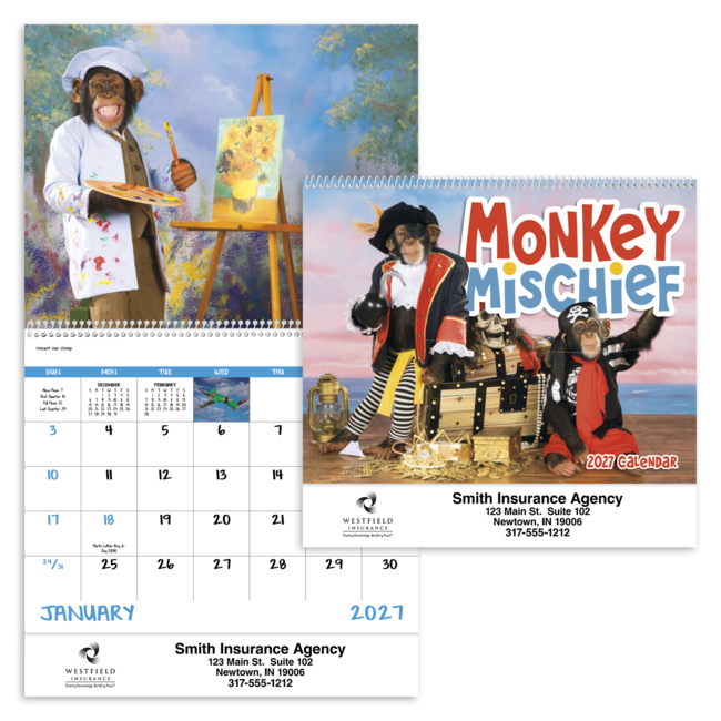 Funny monkeys makes customers laugh at this 13-month calendar. Price includes 1 color print, 1 location (bottom). Bulk envelopes, add $.25 each; inserted, add $.50 each. Full color imprint available, add $.10 each.