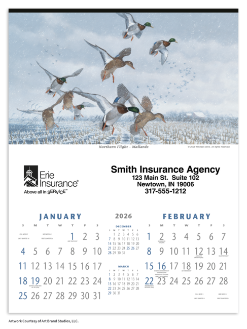 Dramatic wildlife paintings by some of today's most respected and talented wildlife artists are reproduced in this impressive calendar. The FSC® label means that the materials used for this product come from well-managed FSC®-certified forests and other controlled sources. Price includes a 1 color print. Pricing shown is for insurance agents only.