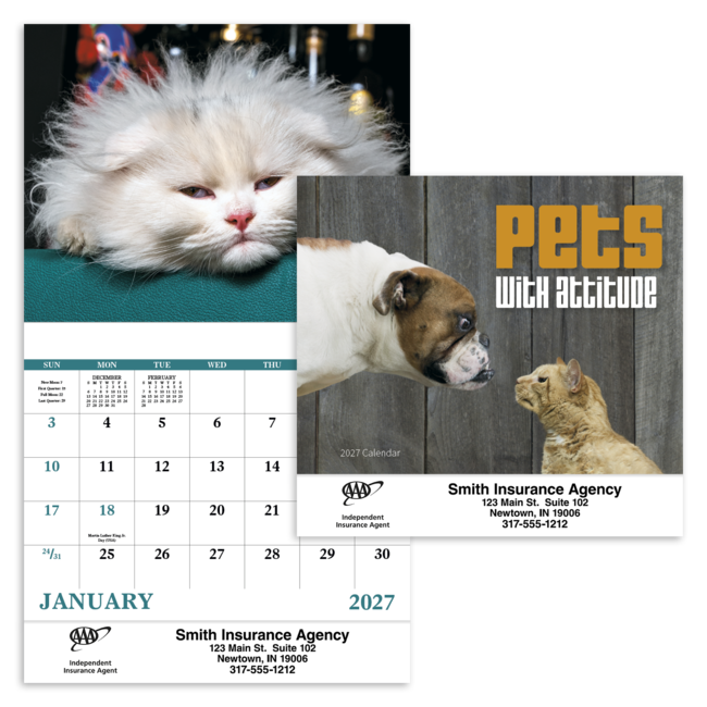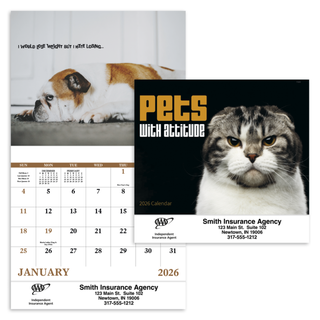Get ready for a year of entertainment with a funny animal calendar sure to keep you grinning month after month with this 13-month calendar. Product pricing includes up to 5 lines of text with one imprint color on gloss paper stock with UV coated cover. Bulk envelopes, add $.25 each; inserted, add $.50 each. Full color imprint available, add $.10 each.