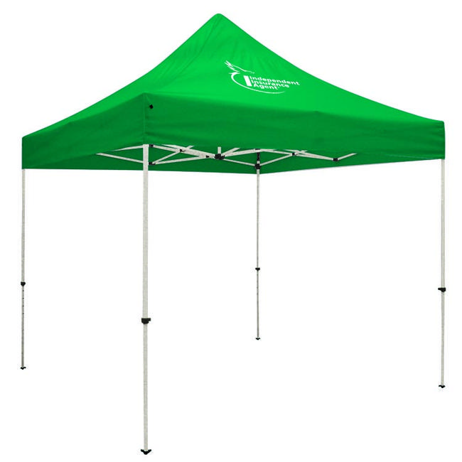 This Premium tent features a strong aluminum frame with sturdy hexagon-shaped legs. Pricing includes a full color print in one location. Available in black, green, navy, orange, red, royal, white and yellow.