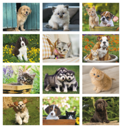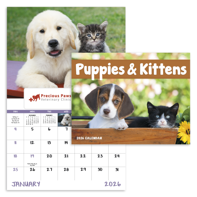 These images of adorable puppies and kittens will truly connect with your customers in this 13-month calendar. Bulk envelopes, add $..25 each; calendars inserted, add $.50 each. Product pricing includes up to 5 lines of text with standard imprint color black on gloss paper stock with UV coated cover.