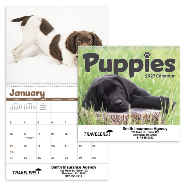 Cute and cuddly puppies bring smiles all year long with this Triumph spiral calendar. Price includes 1 color print, 1 location (bottom). Bulk envelopes, add $.25 each; inserted, add $.50 each.