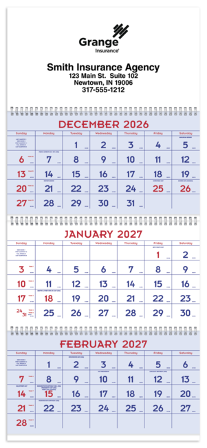 This 14-month calendar runs from December through January. The 4-panel/3 pad style is twin-looped and has a large imprint area. Price includes a 1 color print. Pricing shown is for insurance agents only.