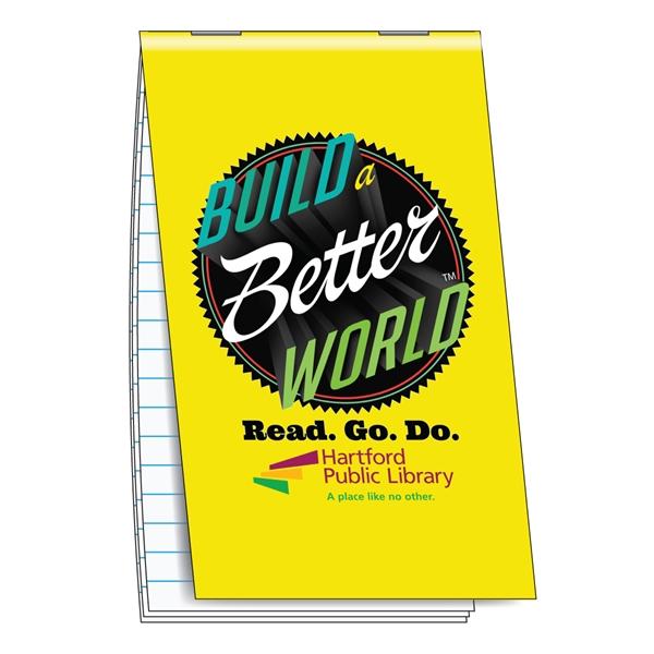 Get more people to see what your brand is all about with this saddle stapled memo book. It measures 3" x 5" with a cover made of white 10 pt. UV coated one-side stock. This has 32 perforated sheets (64 pages) made of 16 lb. white bond-like finish paper that's 1/4" faint line ruled on both sides. This also has two staples on the 3" top. Use our four color process imprint method to add your artwork or company name and immediately draw attention from passersby.