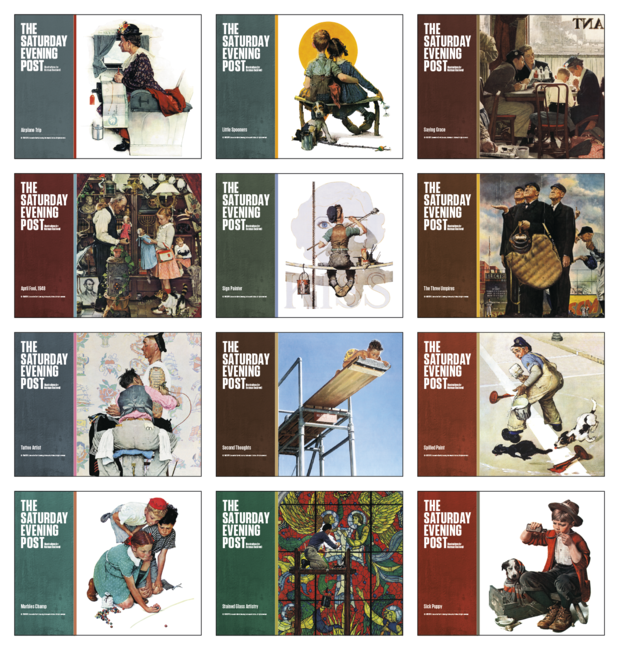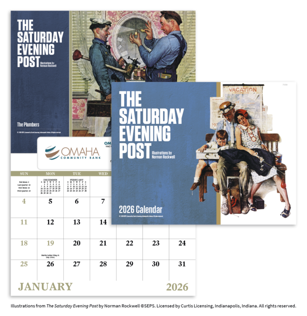 This 13-month window calendar features covers by Norman Rockwell. Price includes 1 color print, 1 location. Bulk envelopes, add $.25 each; inserted, add $.50 each. Full color imprint available, add $.10 each.