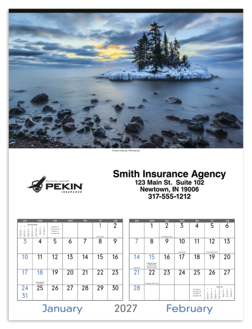 The scenic images on this large-format calendar will kindle your patriotic spirit. The FSC® label means that the materials used for this product come from well-managed FSC®-certified forests and other controlled sources. Price includes a 1 color print. Pricing shown is for insurance agents only.
