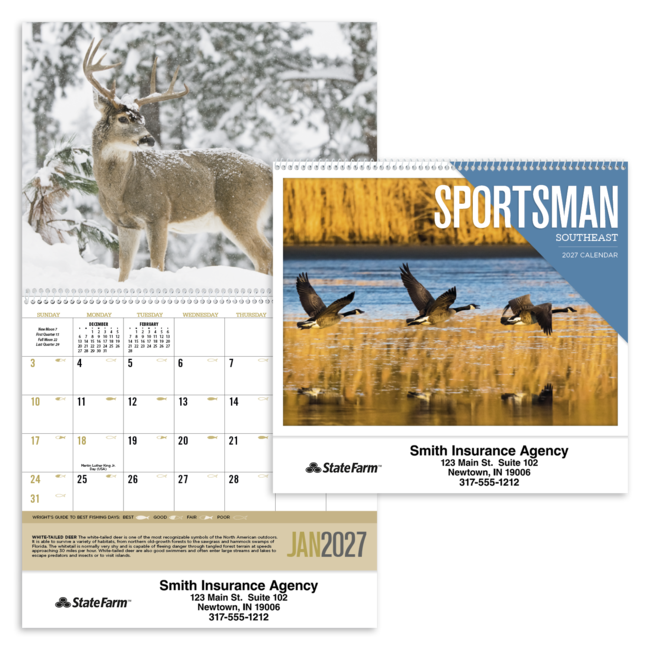 For those who appreciate the outdoors, specialized regional copy in calendar date blocks covering KY, TN, NC, SC, MS, AL, GA, FL & AR. Includes Wright's Guide to the best fishing days. Perfect for planning outdoor activities in advance. Price includes 1 color print, 1 location (bottom). Bulk envelopes, add $.25 each; inserted, add $.50 each.