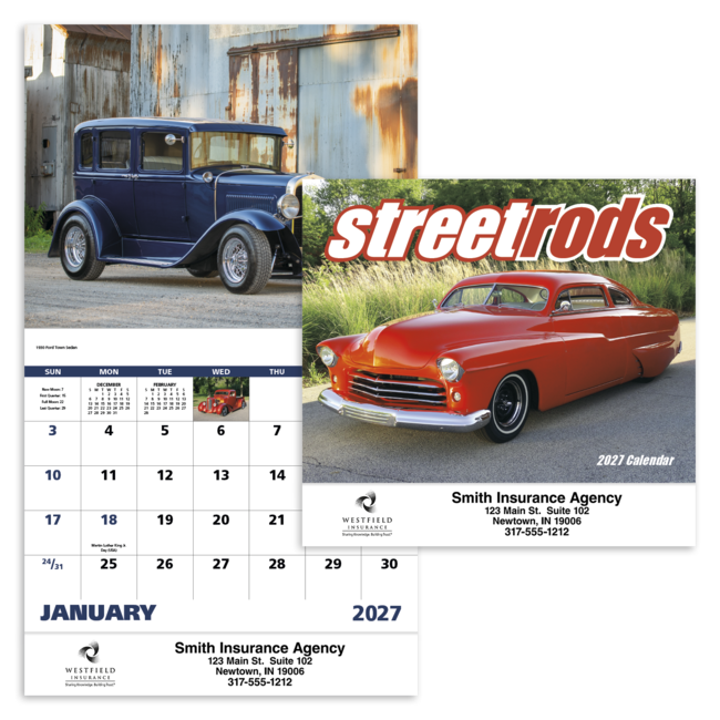 These street rods will steal attention all year in this 13-month calendar. Bulk envelopes, add .$.25 each; inserted, add $.50 each. Full color imprint available, add $.10 each. Product pricing includes up to 5 lines of text with 1 imprint color on gloss paper stock with UV coated cover.