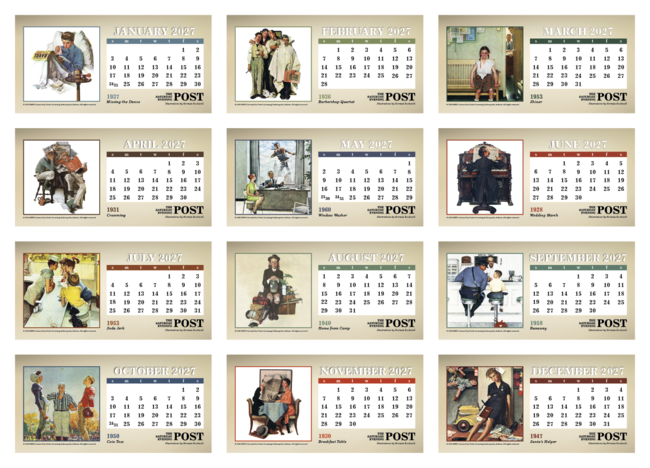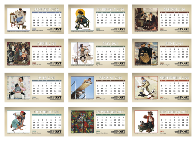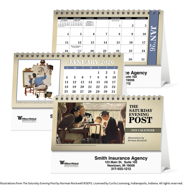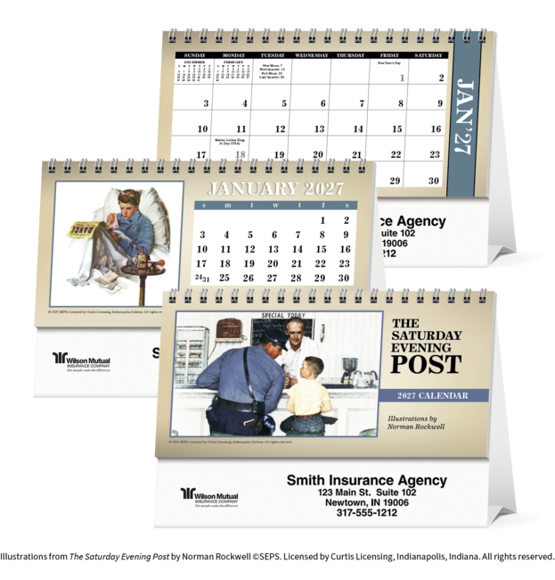 The Saturday Evening Post Illustrations by Norman Rockwell. With desktop display calendars, the message is kept in front of customers every day of the year. This handsome display of American masterpieces is sure to be appreciated. Your ad prints on both sides of the tent mount. Price includes any one color imprint.